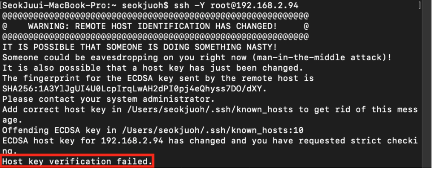 대충 호스트키 변경에 대한 검증 실패했다는 내용이다 찾아본 결과