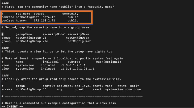 이후 vi 편집기로 vi /etc/snmp/snmpd.conf 파일을 연 후 i 로 편집~!