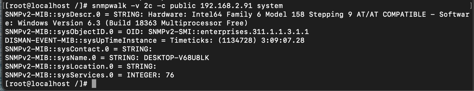 ex) snmpwalk - v 2c -c [community] [source] system