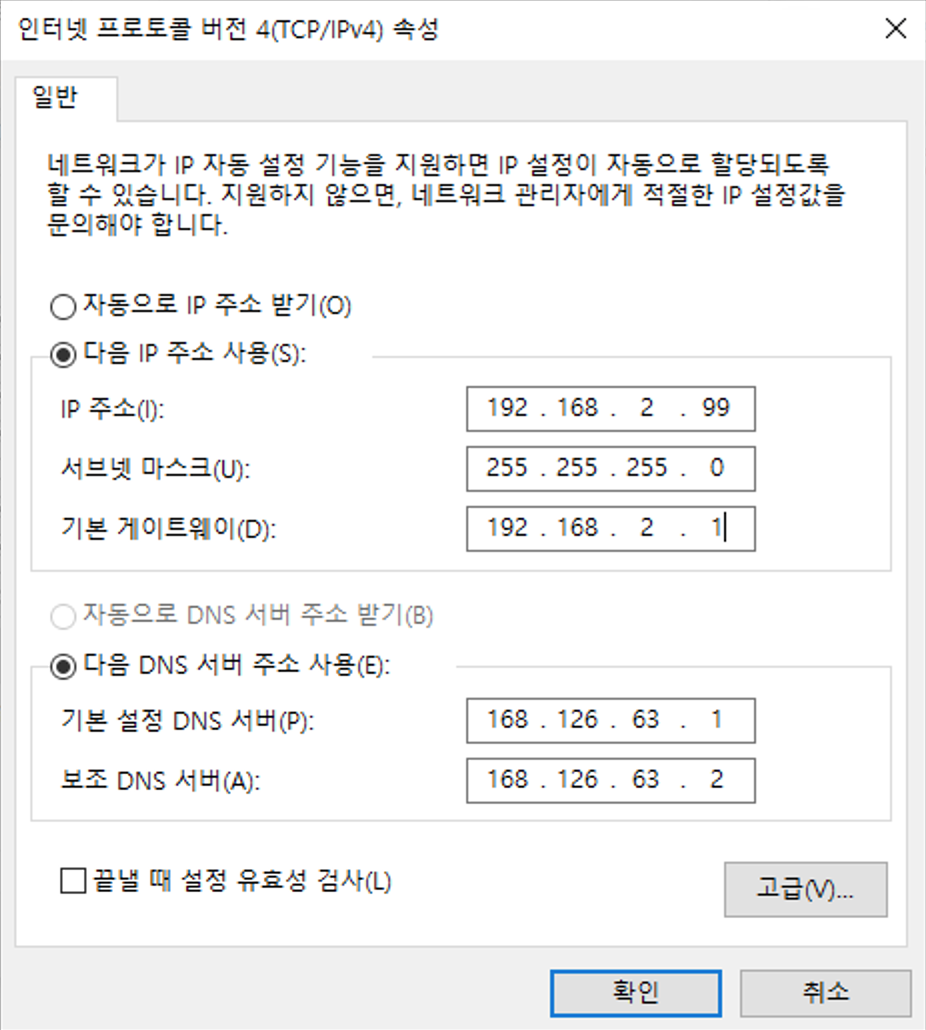 - DNS 서버: 서버는 통신사 DNS서버를 기입하시면 됩니다