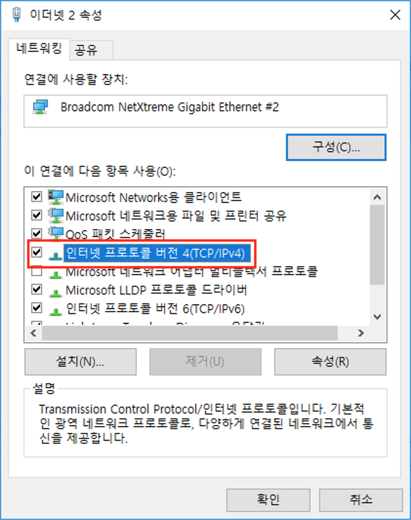 3. 인터넷 프로토콜 버전 4(TCP/IPv4)의 속성을 들어가줍니다