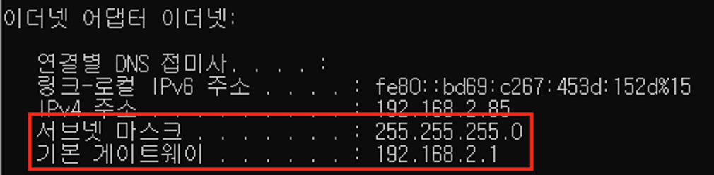 - 서브넷 마스크와 기본 게이트 웨이는 윈도우 cmd창에서 #ipconfig 명령어로 확인하시면 됩니다.