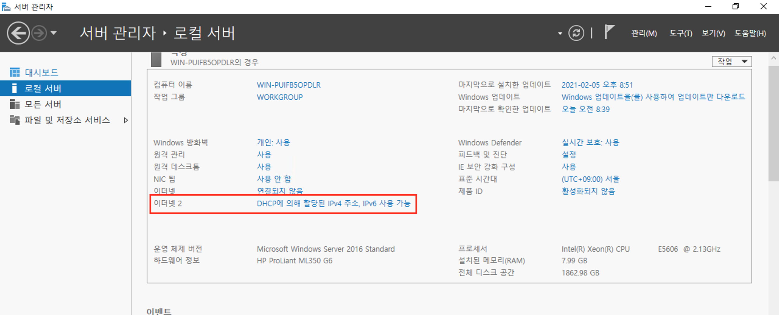 1. 서버 관리자 -> 로컬 서버 -> 'DHCP에 의해 할당된 IPv4 주소 ,IPv6 사용 가능' 으로 들어가줍니다