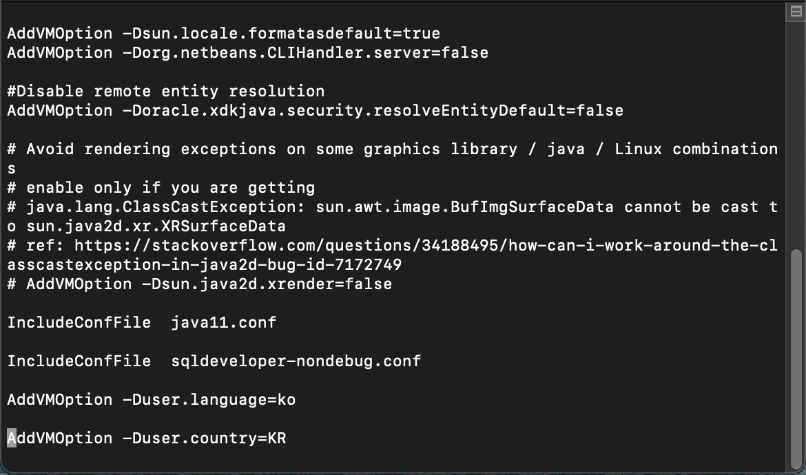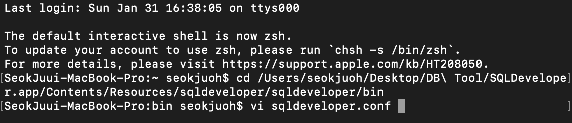 :wq로 저장 후 편집기에서 나와주시면 MAC에서의 SQL Developer 한글설정이 끝나게 됩니다~!!