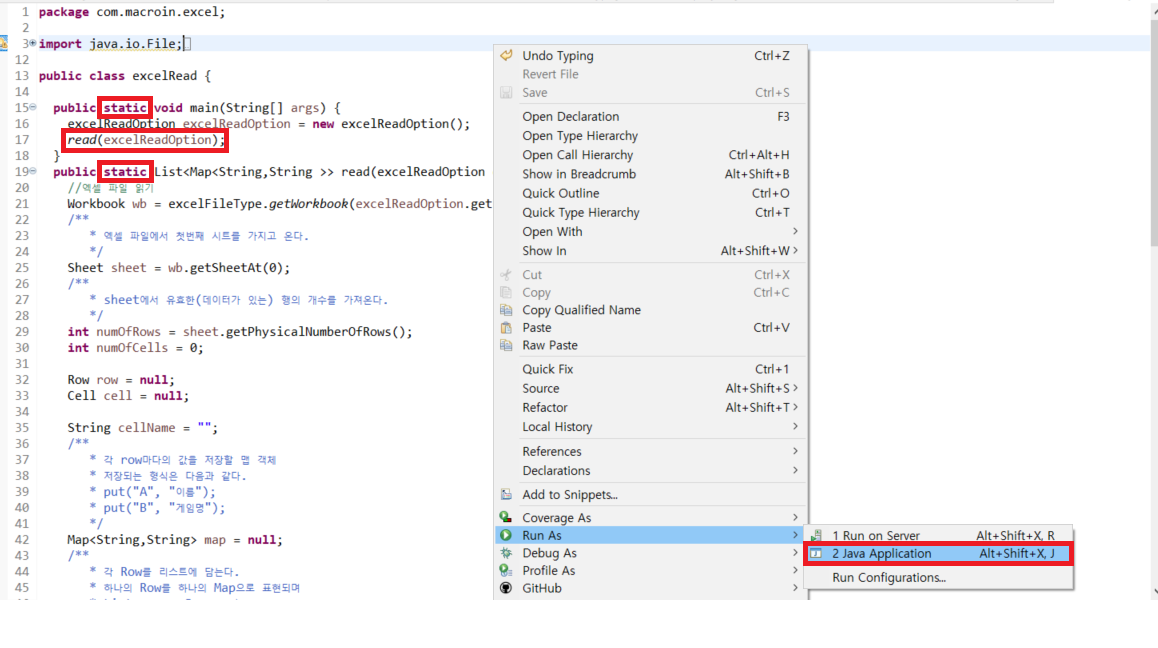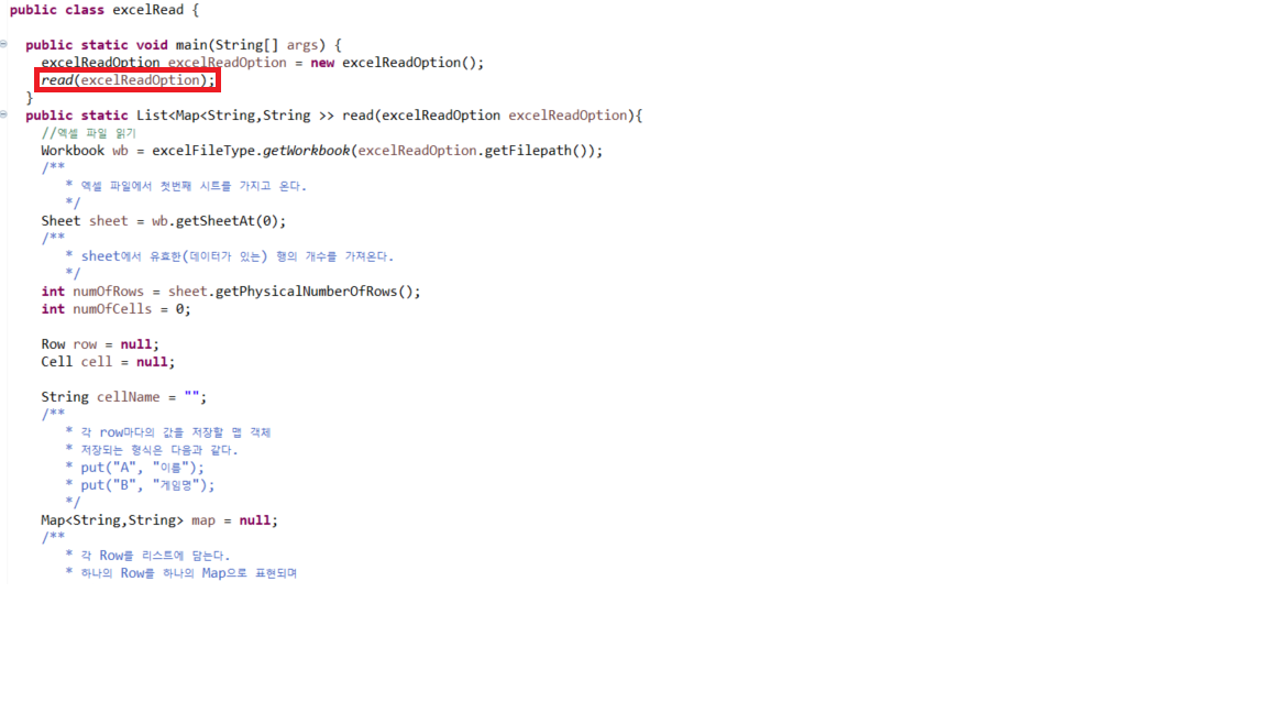 - 저는 excelRead.java 파일 안에 read 메서드를 단독으로 수행하는 예로 들겠습니다.