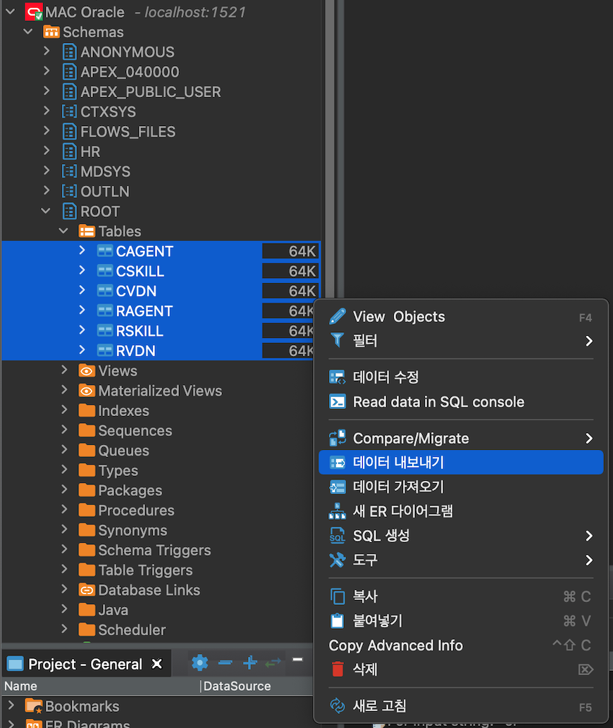 덤프할 데이터가 덤긴 테이블 오른쪽 버튼 -> 데이터 내보내기